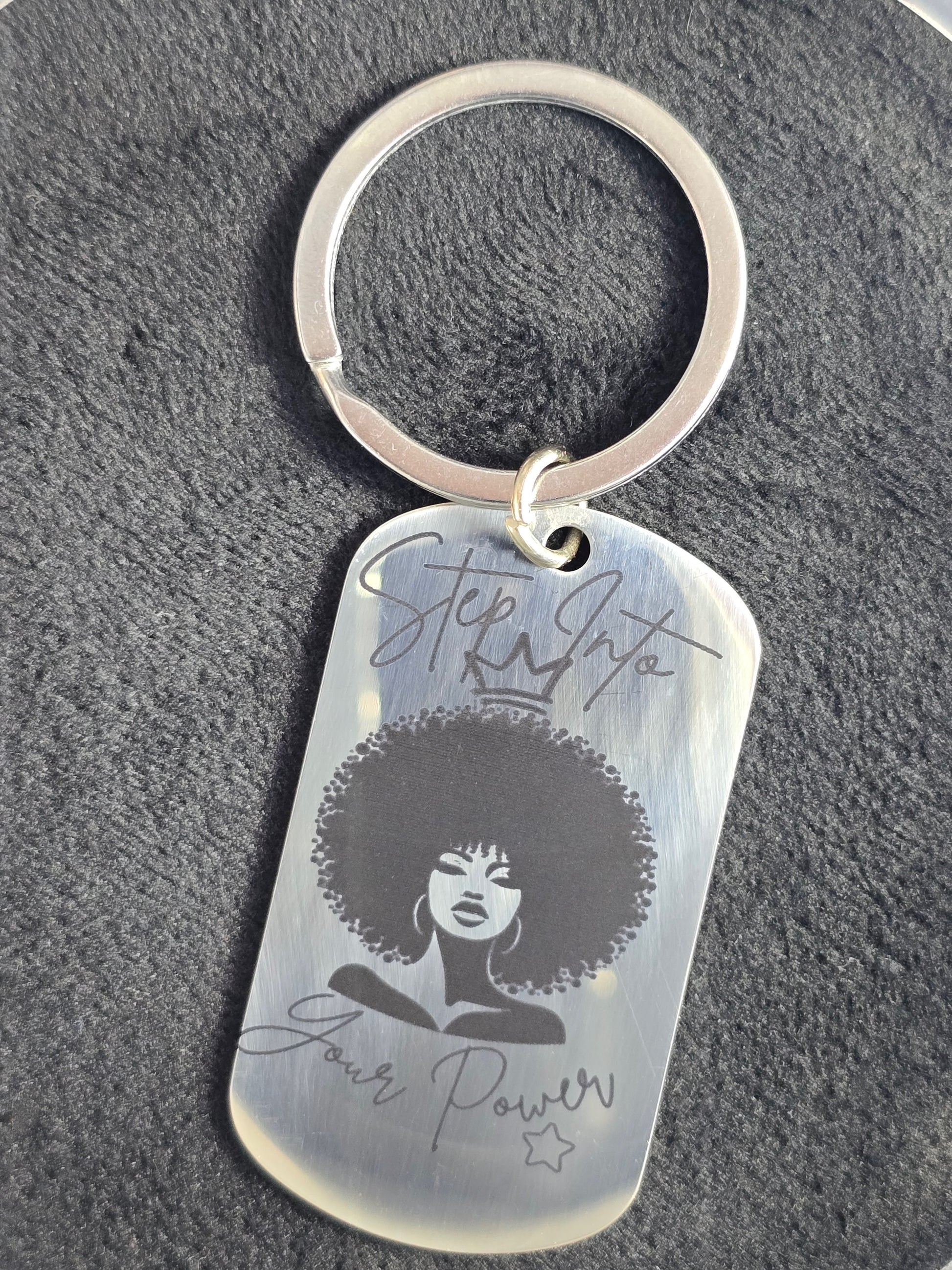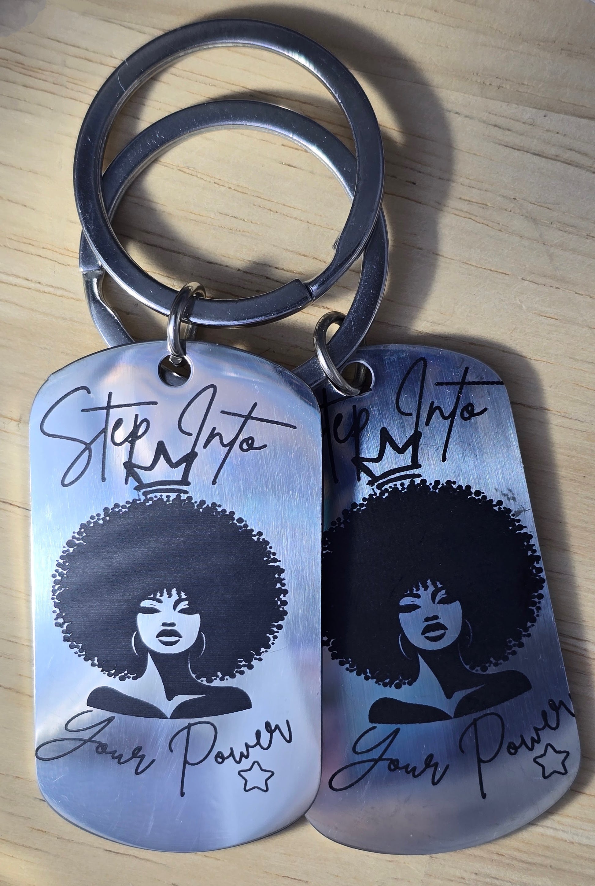 Let this 2 inch stainless steel keychain be a reminder to "Step Into Your Power." With a laser engraved afro woman, this keychain will inspire confidence and self-love in anyone who carries it. Keep your keys close and your spirit shining with this fun and unique accessory.