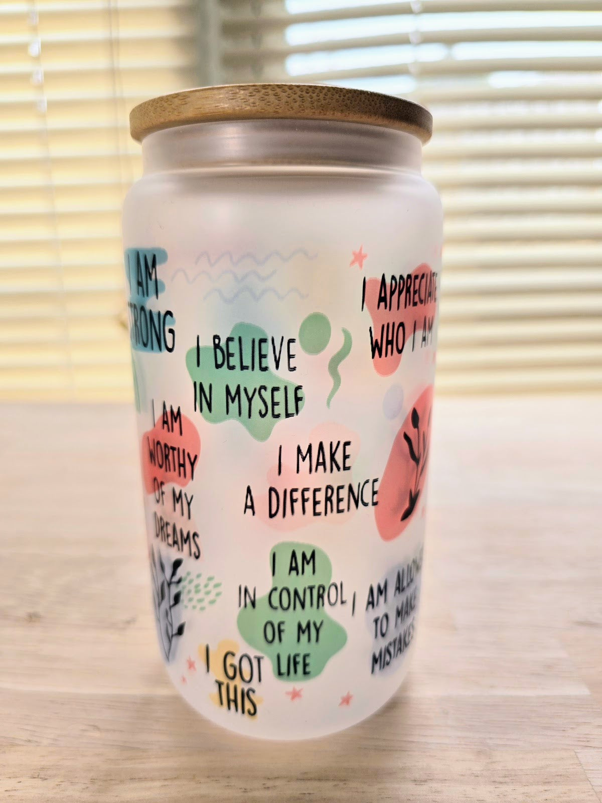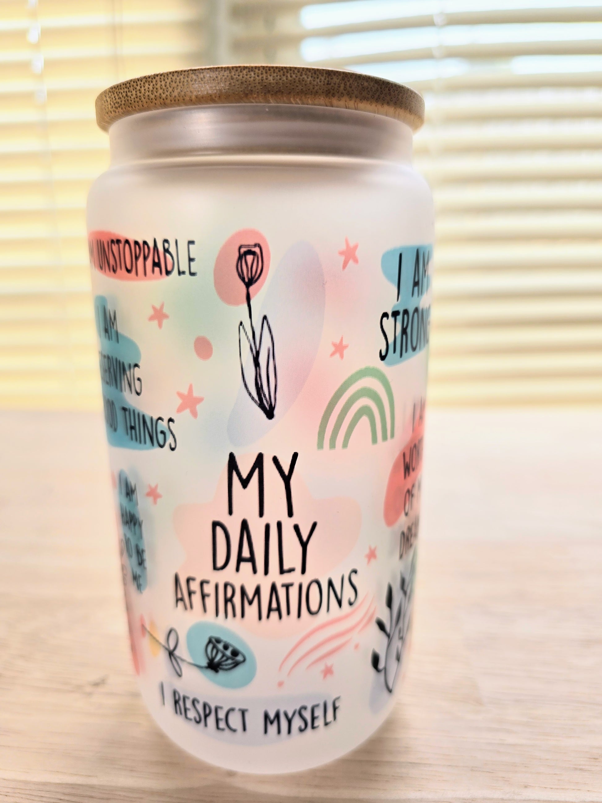 Start your day with a positive outlook with our Daily Affirmation Glass. This colorful cup serves up a daily dose of positivity to help you conquer the day. Brighten your mornings and inspire yourself with this quirky and fun addition to your routine. Can't have too many good vibes, after all!