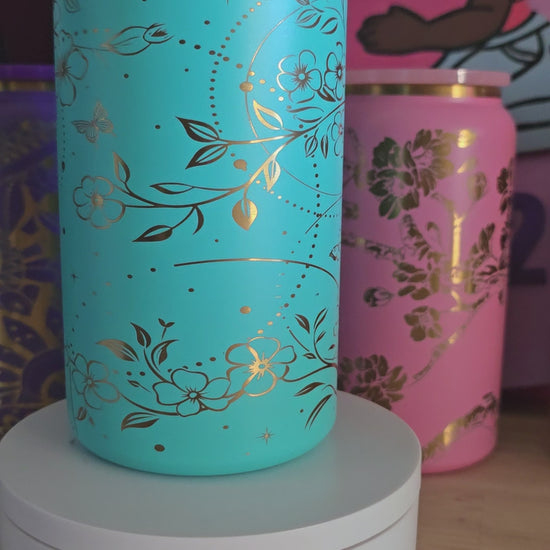 Little Bit o’ Whimsy is for the dreamers, the butterfly chasers, and anyone who finds beauty in the small details. This 16 oz powder-coated tumbler glows in bright turquoise with delicate golden floral engravings, dotted with butterflies and stardust patterns that feel straight out of a fairytale.