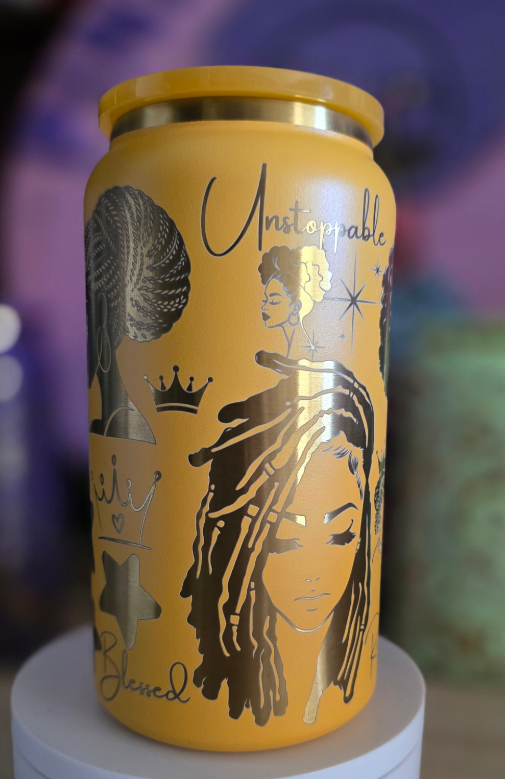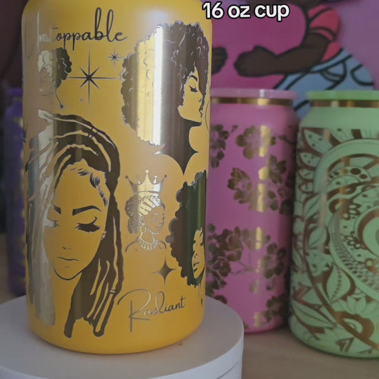 Meet the little sister to our original 40 oz Sista Tumbler — bold, radiant, and unapologetic. The Sista Cup is a 16 oz gold-rimmed tumbler, engraved with designs that celebrate Black woman beauty, strength, and culture.